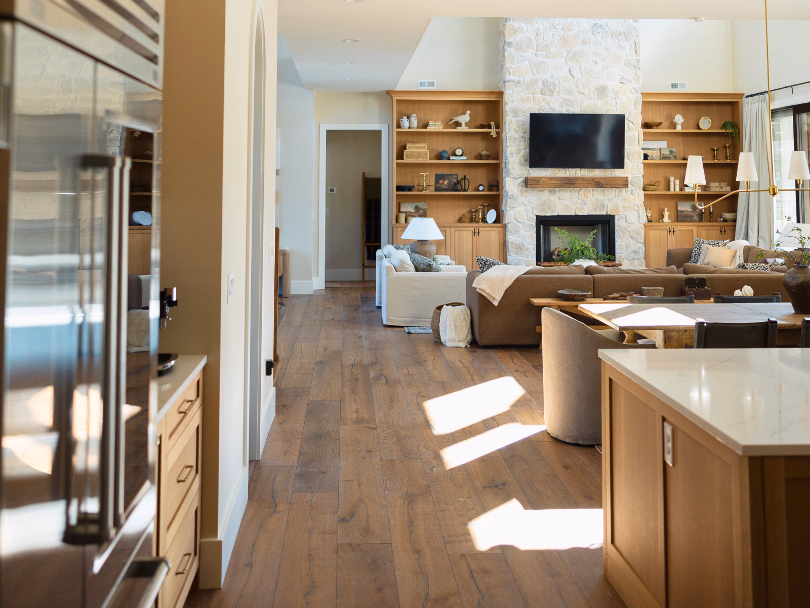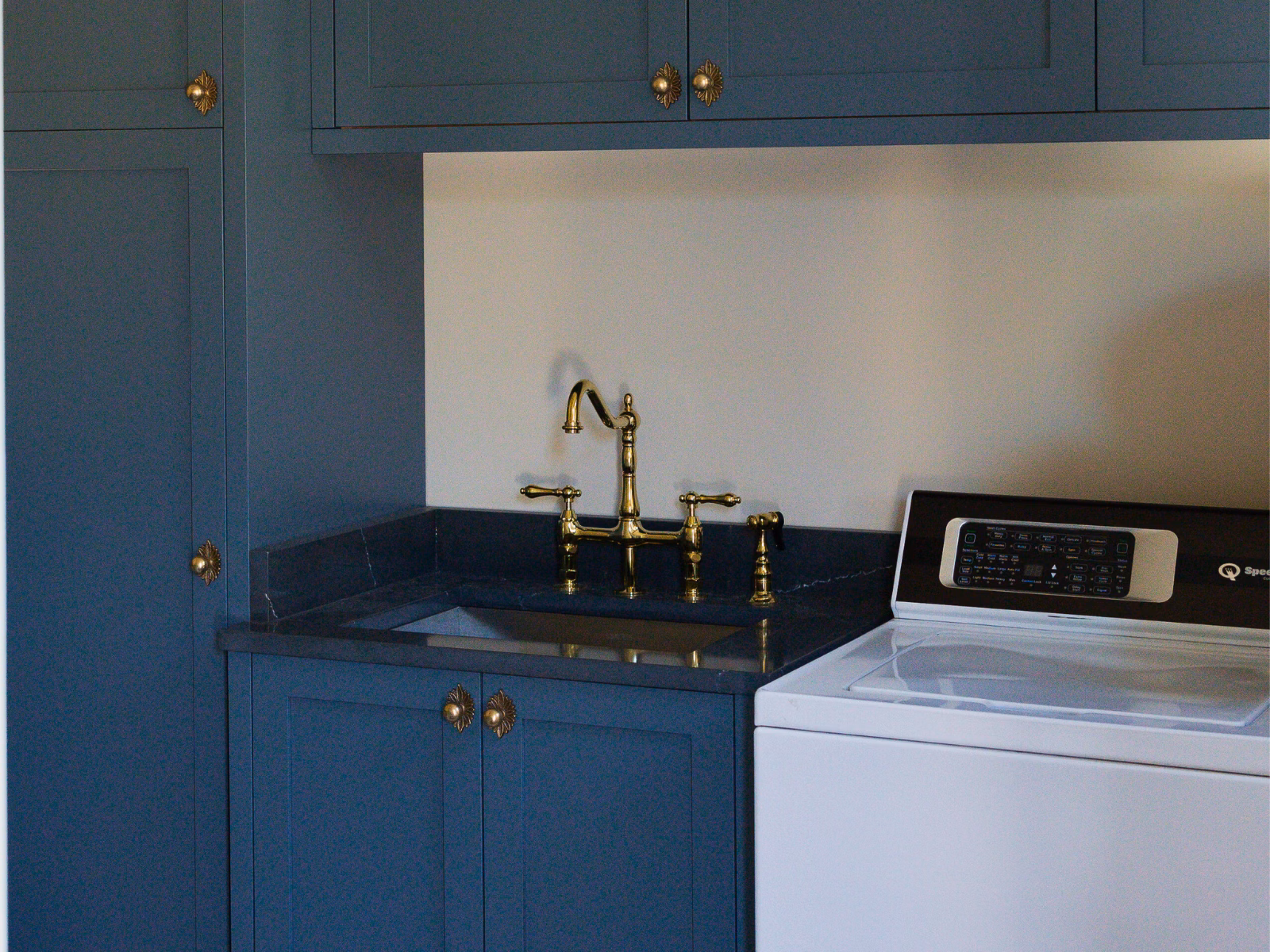 We had the privilege of making dreams come true in Greenville, South Carolina. The living room’s white oak custom floating shelves were clear-coated, adding class and sophistication to the house. By crafting both the custom living room bookshelves and the kitchen cabinets from white oak hardwood and finishing them with a clear coat, we created a cohesive look that ties the home together. Did you notice the laundry room sink? With a pop of color, laundry will become a bit more bearable. All of these custom cabinetry projects installed in Greenville, South Carolina, were made from quarter-sawn wood, resulting in stronger, long-lasting, elegant custom cabinetry.